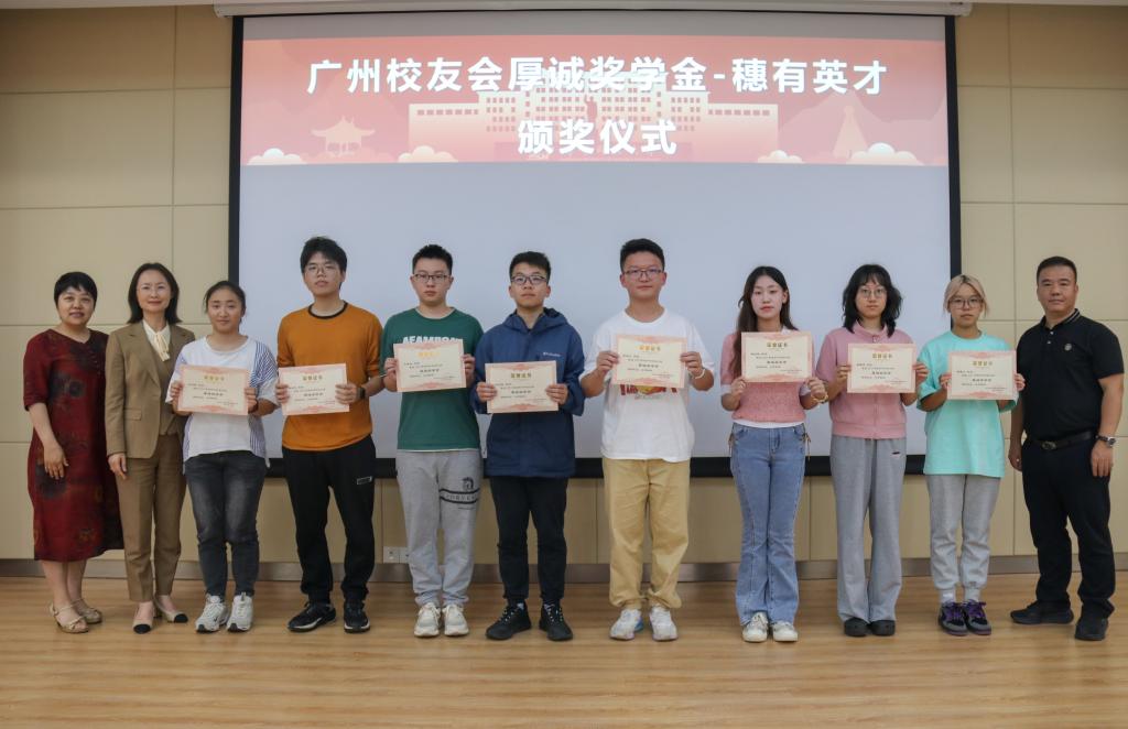 随后,戴则健处长宣读了获奖名单并举行颁奖仪式,共有24名来自广州的新生获评2023年度厚诚奖学金。广州校友代表给获奖的学生颁发了证书。