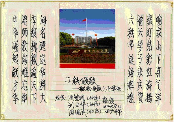 2012年9月12日,足球比分直播 64届校友周繁增、66届校友刘运华和90届校友周国武共同作诗献给母校六十华诞: