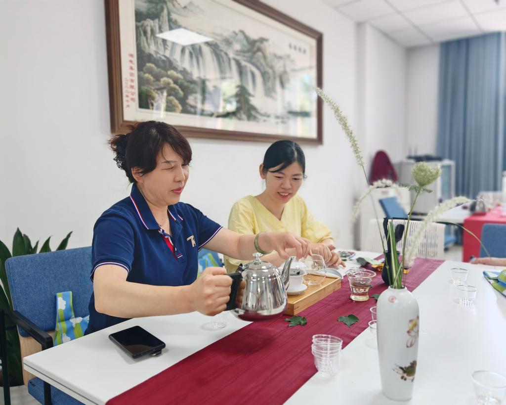 活动现场,茶艺师团队通过"理论+实操"的教学模式,系统解析了六大茶类的养生机理,着重演示了品茶奉茶、冲泡手法等茶艺技巧,并现场示范了“三龙护鼎”“叩指礼”等传统茶艺。在分组实践环节,老师们亲手体验盖碗冲泡、茶汤品鉴等流程,伴着《半山听雨》的悠长韵律,大家互敬香茗,笑语连连。"原来茶氨酸对缓解脑力疲劳有显著作用,这杯乌龙茶真是喝出学问了!"高压系王燕老师在交流时感慨道。