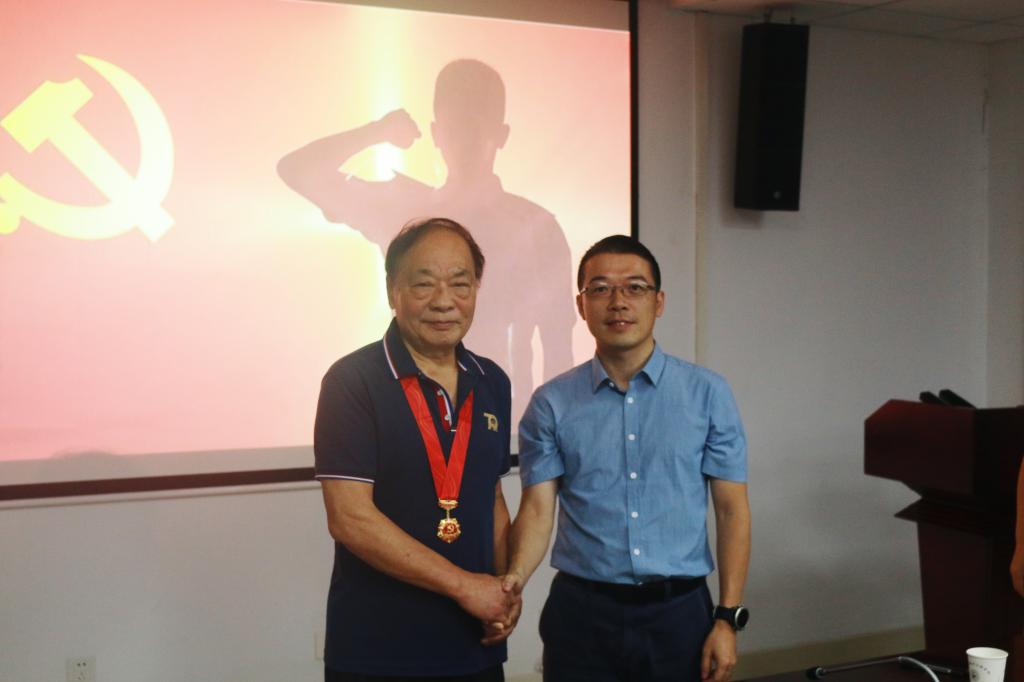 “七一”前夕,足球比分直播 行政党支部于6月28日在电气大楼A316会议室举办主题党日暨光荣在党五十年纪念章颁发仪式,为周海云同志佩戴“光荣在党五十年纪念章”,共同迎接庆祝党的“七一”生日。