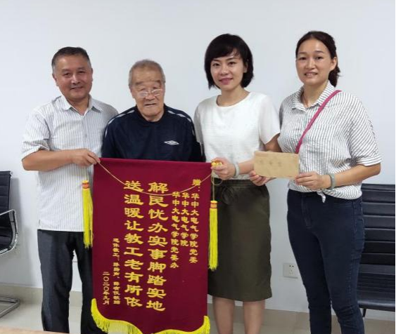 党委送来一面锦旗,感谢学院及时地为他们夫妻俩返回武汉养老提供便利,解决了他们第三代孙子入学的问题。孙扬声和薛有仪夫妇均已高龄,生活难以自理,需要依赖媳妇带着4岁半的孙子回来长期照料,孙子读书问题一直是他们难以回武汉的首要问题。在孙老师一家感到非常无助的时候,朱老师及时把他们的困难反映给了学院领导,学院领导极为重视,要在政策允许范围内,学院就要努力把这件事情办好。党办接受任务后朱老师马上想到薛老师是参加过抗美援朝的军官应该符合国家退伍军人的照顾政策,他抓紧时间查阅文件资料、吃透文件精神,撰写报告说明情况,不辞辛苦奔波于各有关部门及时解决了问题,这种工作效率既体现了他军人的作风,也与他平常关注收集掌握退休老师困难信息,健康信息、经济信息和需求信息有关。几十年来朱瑞东老师尽心尽责为退休教职工消除后顾之忧,全心全意为广大退休教职工服务努力提升退休教职工的幸福感和归属感,用自己的实际行动尊老爱老当好退休教职工的贴心人,用爱心温暖夕阳红。