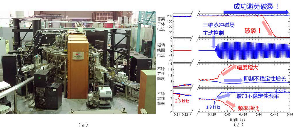 (a)J-TEXT 托卡马克装置 (b)成功地实现了J-TEXT 托卡马克等离子体的高稳定控制